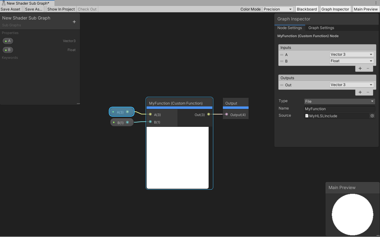 When you use File mode for the Custom Function node, you must manually format the functions properly. One thing to note when creating custom functions for Shader Graph is the precision suffixes. The generated code appends a precision suffix to function names. Your include file function must also append your desired precision suffix (shown below with _float), or contain multiple functions with both _float and _half suffixes, but your Name field must not include the precision suffix.