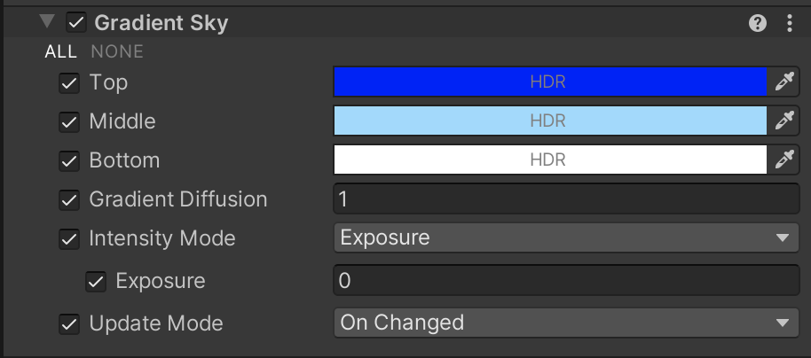 The Gradient Sky Volume Override component exposes options that you can use to define how the High Definition Render Pipeline (HDRP) updates the indirect lighting the sky generates in the Scene.