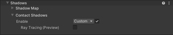 - Select a Light and, in the Inspector, go to Shadows > Contact Shadows and tick the Enable checkbox. This exposes the Ray Tracing property.
