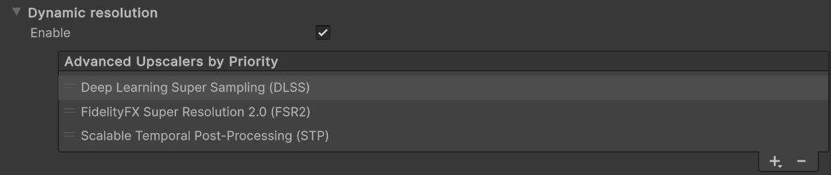 Support for the Spatial-Temporal Post-Processing (STP) upscaler has been added for all platforms. This upscaler produces higher quality visuals than the existing TAAU upscaler, but it only supports dynamic resolution when the hardware dynamic resolution mode is active. This means APIs such as DX11 are only capable of using STP when the resolution scale is forced to a fixed percentage.