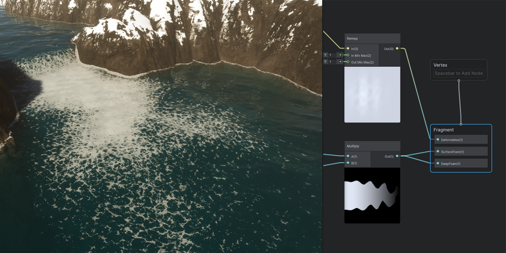 Support of GameObject transform on Water Surfaces have been improved. Infinite Oceans and surfaces with Instanced Quad geometry can now be translated and rotated, and support setting a negative scale to flip the surface. Added a Water Decal target for ShaderGraph in order to output water deformation and foam directly to the atlas, and avoid going through a CustomRenderTexture. Using the same graph also simplifies authoring when deformation and foam generation are linked. Additionally foam is now animated to follow the current direction.