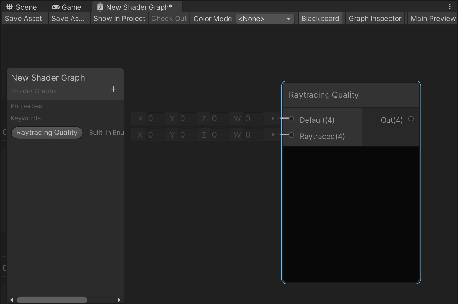 To use ray-traced effects with Shader Graph, use the Raytracing Quality Keyword node. This node exchanges accuracy for speed, except for Path-Traced effects which aren't affected and use the default path.