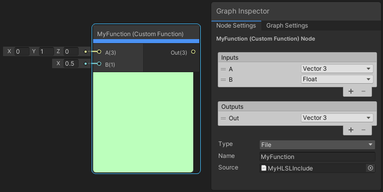 When you use File mode for the Custom Function node, you must manually format the functions properly. One thing to note when creating custom functions for Shader Graph is the precision suffixes. The generated code appends a precision suffix to function names. Your include file function must also append your desired precision suffix (shown below with _float), or contain multiple functions with both _float and _half suffixes, but your Name field must not include the precision suffix.