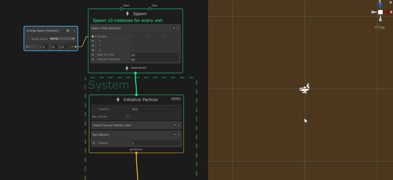 The Spawn Over Distance Block calculates the displacement of a position relative to the previous frame's value. Depending on this size of the displacement and the Rate Per Unit property, the system spawns a particle.
