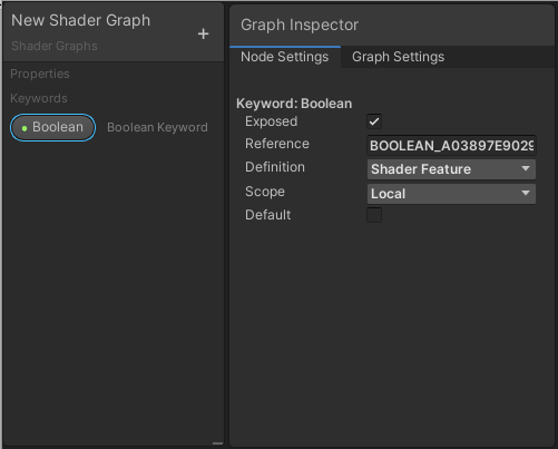 All Built-in Keyword fields in the Node Settings tab of the Graph Inspector are grayed out except for the Default field, which you can enable or disable to show the differences in Shader Graph previews. You also cannot expose Built-in Keywords in the Material Inspector.