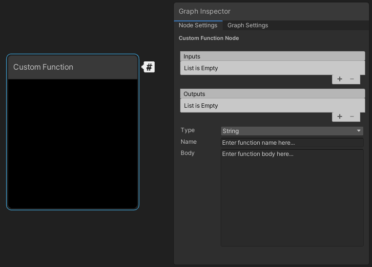 Use the Create Node Menu to create Custom Function nodes. By default, new Custom Function nodes don't have any input or output ports. In the Graph Inspector, open the Node Settings to access the Custom Function and Custom Port Menu menus.