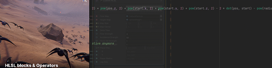 Version 16 includes a new block and operator that you can use to write custom HLSL code directly in a VFX Graph. You can use this to script complex behavior in a single node. You can embedd custom HLSL code in the node or load it from an external file to reuse the code.