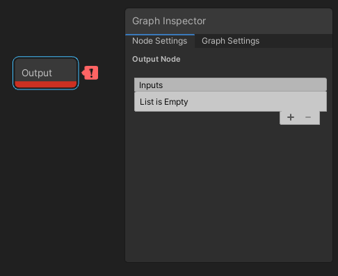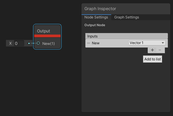The Custom Port Menu is displayed in the Node Settings tab of the Graph Inspector by clicking on the Custom Function Node and Sub Graph output node. This menu allows you to add, remove, rename, reorder, and define the types of your custom input and output ports.