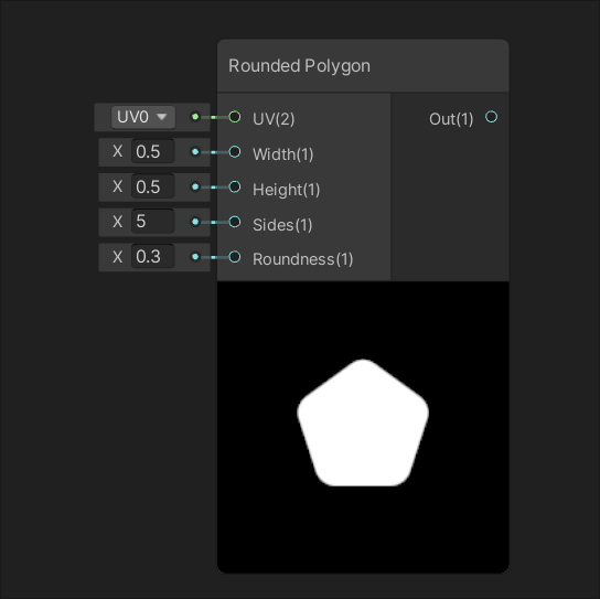 | Generates a rounded polygon shape based on input UV at the size specified by inputs Width and Height. The input Sides specifies the number of sides, and the input Roundness defines the roundness of each corner. |