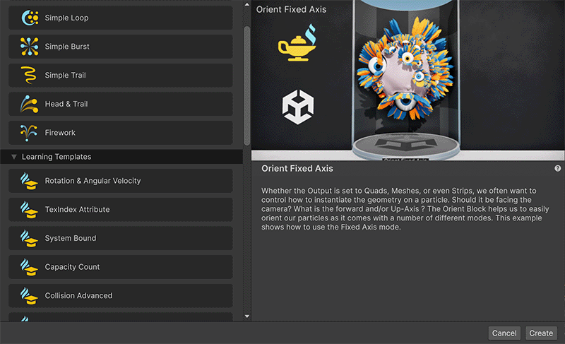 The Learning Templates sample is a collection of VFX assets designed to help you learn about VFX Graph concepts and features. This collection will be updated based on community feedback and new features. This page provides instructions on how to install the sample, a brief overview of the content, and how to make the most of it.