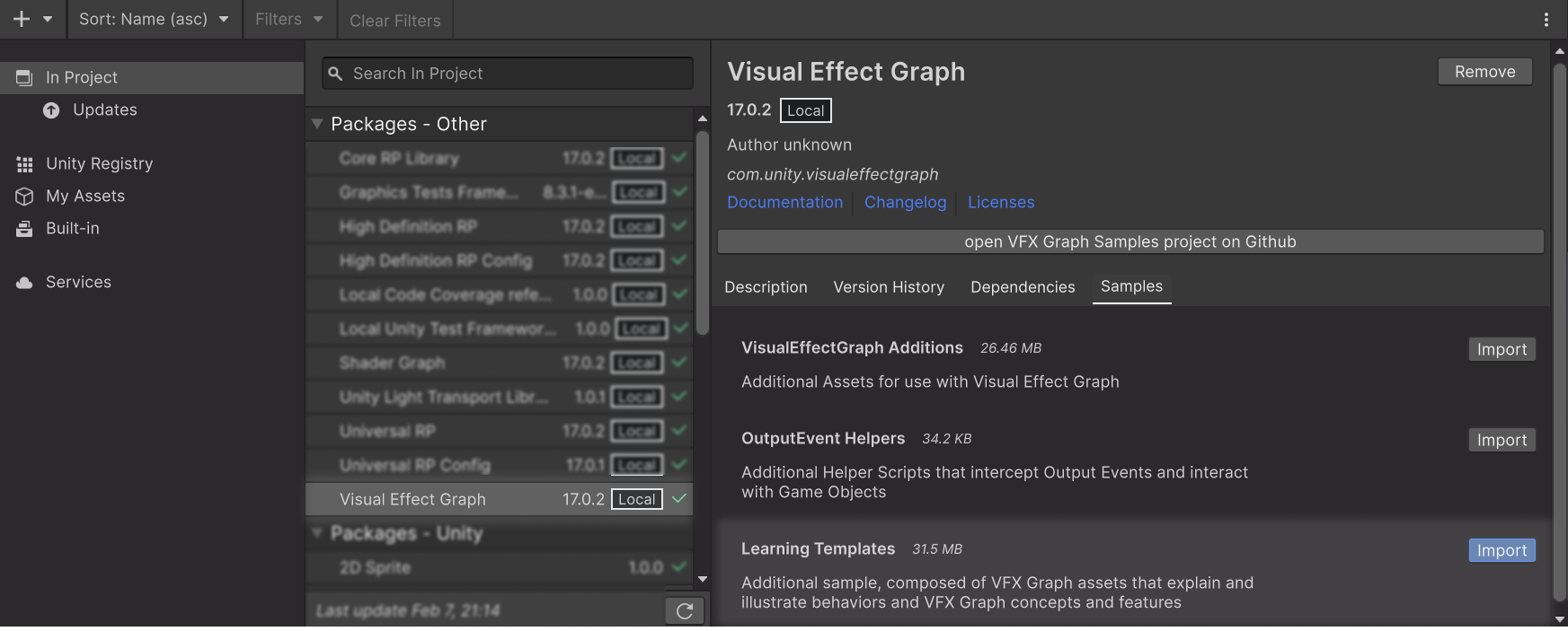 2. From the Package list view, select Visual Effect Graph.