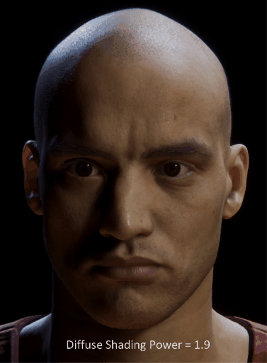 The following image shows the effect of increasing Diffuse Shading Power on a human face model.