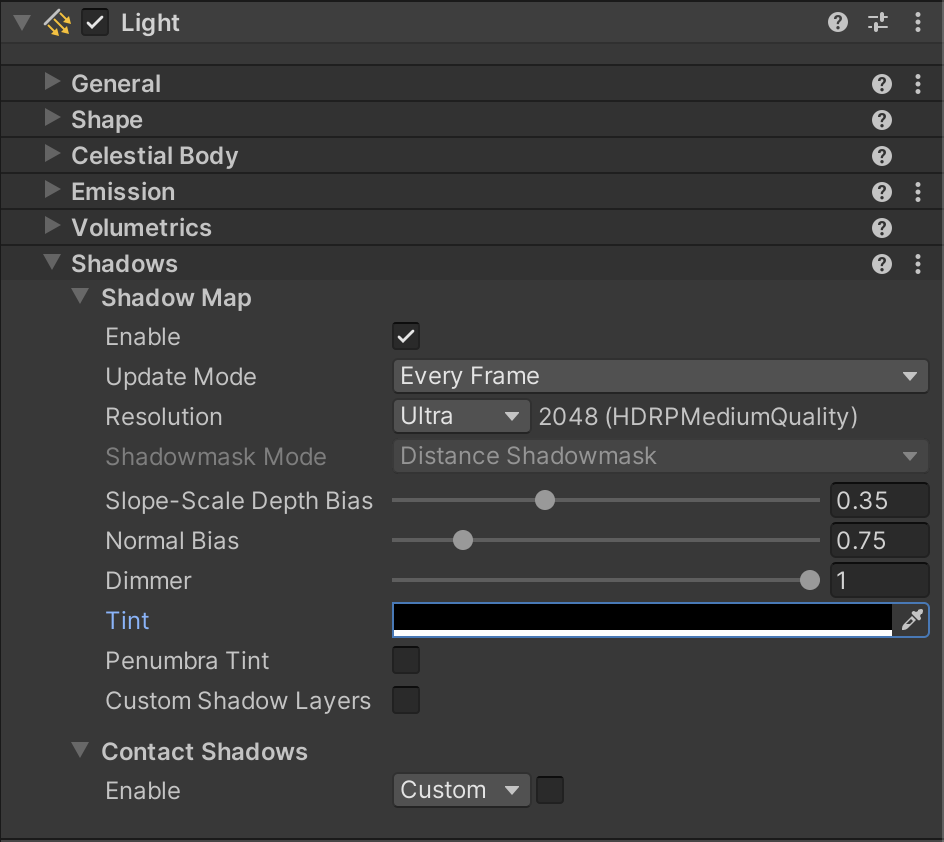 - For Punctual lights, go to Lighting > Shadows > Punctual Light Shadows. For Area lights, go to Lighting > Shadows > Area Light Shadows.