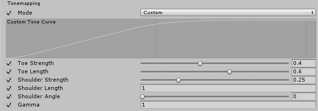| Mode | Only available in the High Definition Range mode. Select the Tonemapping mode from the dropdown menu. None: No Tonemapping applied. Neutral: Applies a range-remapping with minimal impact on color hue and saturation. ACES: Applies a close approximation of the reference ACES tonemapper for a cinematic look. This effect has more contrast than Neutral affects color hue and saturation. When this tonemapper is enabled, all grading operations are performed in the ACES color spaces for optimal precision and results. Custom: A fully parametric tonemapper. This is the only tonemapper with its own settings. |